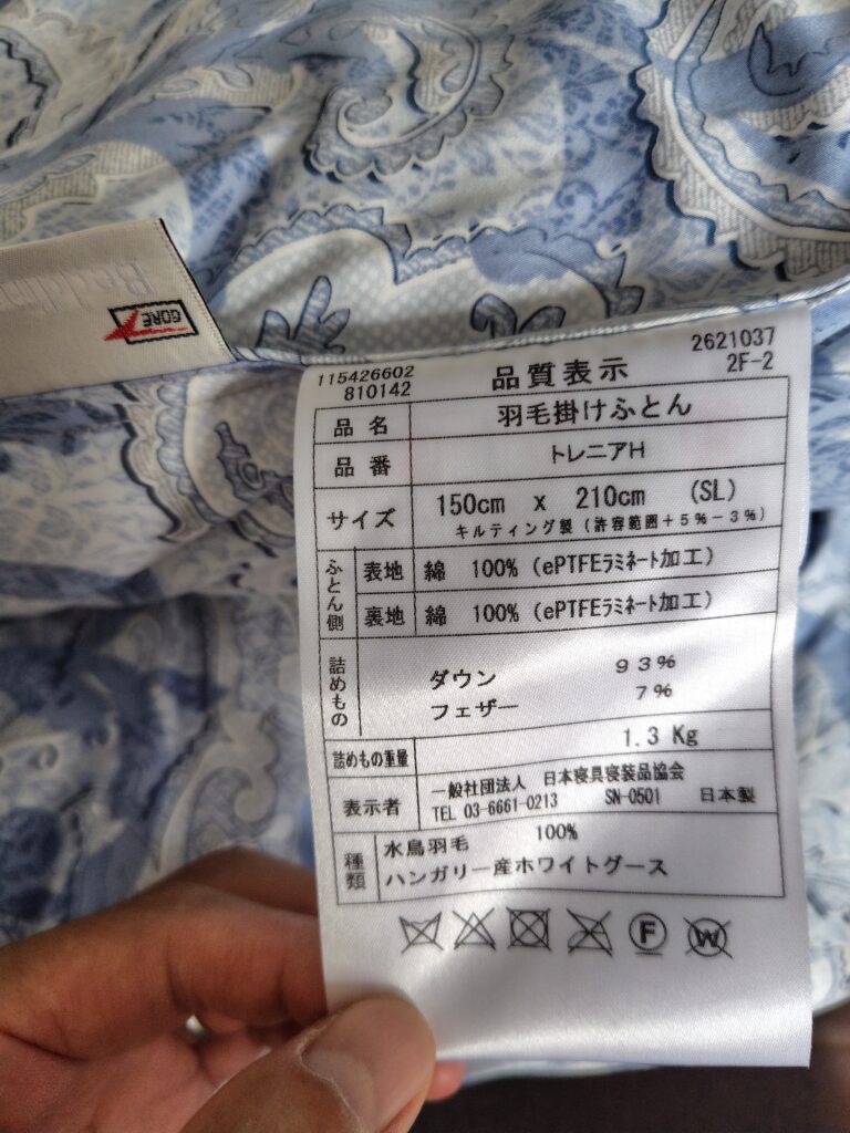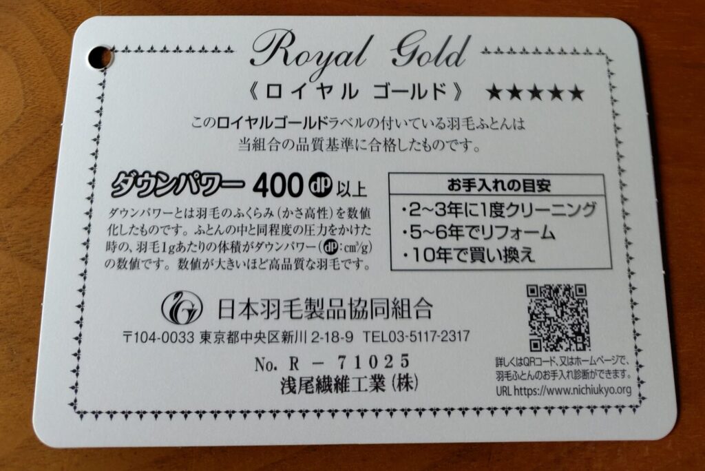 そんな羽毛を使った、布団自体のランクも明確に定義されています。今回私の購入した布団は「ロイヤルゴールド」です。