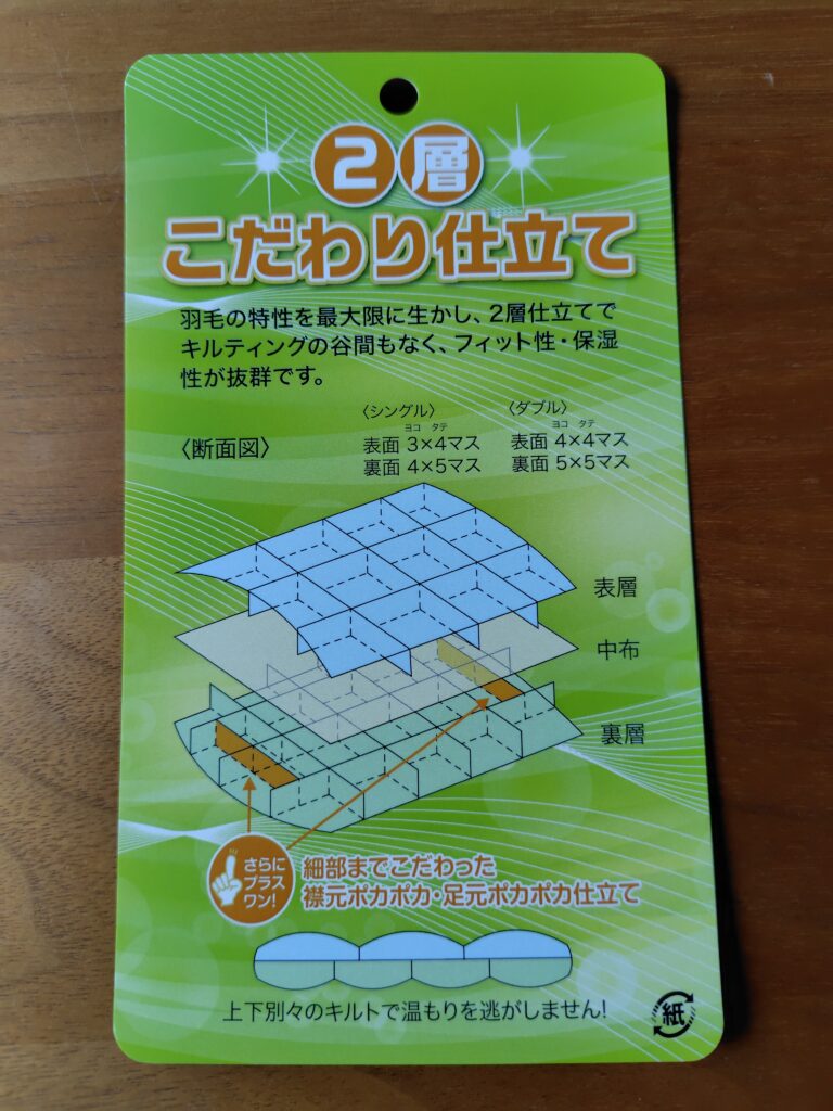 布団を上下の2階層にし各々の縫い目を互い違いにすることで、温もりを逃がさない裁縫技術です。これも断熱効果抜群で、寝心地全然違います。もちろんその分価格は高くなりますが・・・。