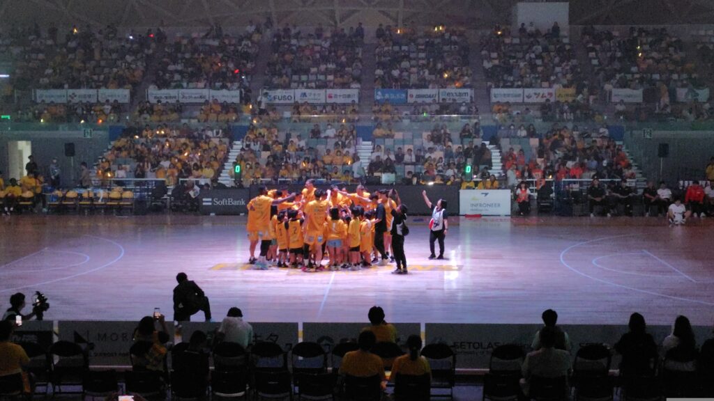 ファウルが辛い中、今林選手の連続3P!既に喉が潰れていて「ハリックス55」をうまく言えない。構うもんか。それでも家族みんなで叫ぶ。この状況で沈黙は不可能だ。
