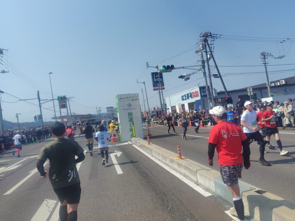 綾川の折り返し地点まで来ても「4:30」のペースランナーの姿は見えない。やはりと言うか、やっぱり左足はスタート早々に痛みを発していた。しかし、アドレナリンが左足を黙らせる。「行けるところまで行こう」。私は自分の足と、EVO SL WOVENに話しかける。普段20km走をしているため、この時はまだまだ行ける感覚があった。ちなみにレース中の写真はここが最後。この後苦しい時間が増え、携帯電話を操作する余裕を徐々に失う。