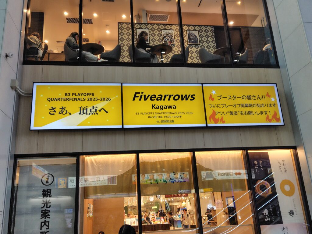 4/28(火)、B3リーグプレイオフクォーターファイナル香川ファイブアローズVS金沢武士団(サムライズ)GAME1を現地観戦してきたので、観戦記として書き残す。やってきましたプレイオフ。この日を見越して随分前から(特にマインドを)準備してきた我らが香川ファイブアローズ。やってくれると信じて、仕事終わりの電車に飛び乗り駆け付けた。