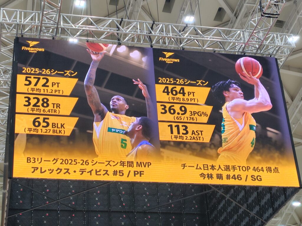 対する我らが香川ファイブアローズ。レギュラーシーズンは堂々の1位通過。個人賞とは無縁の「全員バスケ」でつかみ取った1位でした。B3リーグレギュラーシーズンMVPは我らがキャプテン#5AD(アレックス・デイビス選手)、ベスト5に#46(今林)萌(選手)が選ばれています。ADは言わずもがな、今やファイブアローズの心臓です。とにかく「頼れる度」が半端ない(語彙力)。昨シーズンの悔しさをバネに優勝まで駆け抜けて欲しい。萌は今シーズンから移籍してきてくれて、プレシーズンマッチの「VS千葉ジェッツふなばし戦」からいきなりの大活躍。シーズン通してその得点力を発揮してくれました。私的にはたまに見せるとんでもない跳躍力でもぎ取るリバウンドも好みです。あと我が家的に、単純に見た目も好みです。筋肉凄い。。