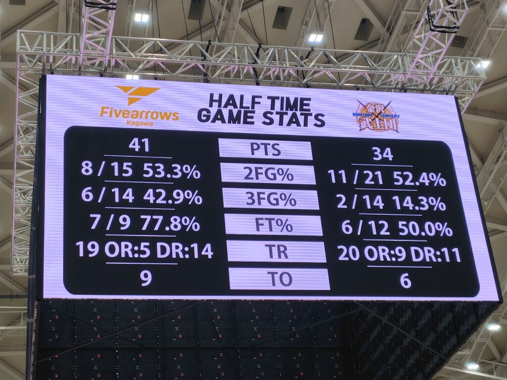 19:25 #4克実、#5AD、#13(高橋)育実(選手)、#21ブライアン(鎌田真選手)、#31タッカーで第2Q開始。金沢#2東野選手のジャンパーで幕開け。立ち上がり早く1本欲しい所だがなかなか決まらず金沢#9大森選手にも決められ21-18と詰め寄られる。この#9大森選手はファウルもらうのもうまく、要所要所でいい仕事してました。
