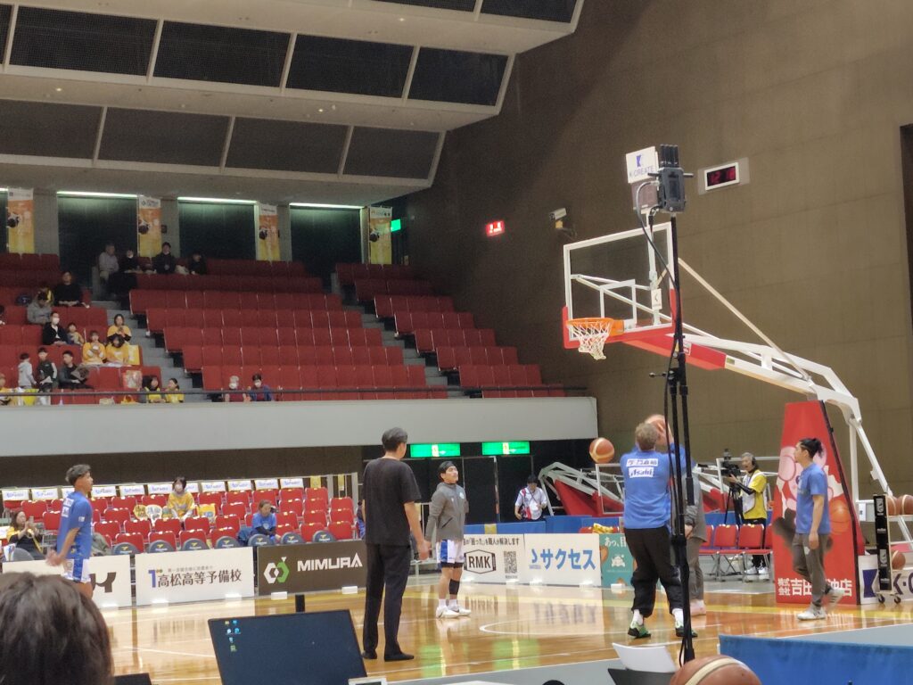 12:00 持参したお昼ご飯を食べながら選手達のアップを見守る。親戚のオジサンみたいなこと言いますが、久しぶりに選手達を見ると、みんな髪型とか変わってて時の流れを感じます。#1サトダイ(佐藤大介選手)と#17(福田)健人(選手)、#24リッチー(ニューベリー・リチャード選手)がシュート打ってないので、前回のホームゲーム、善通寺開催のしながわシティバスケットボールクラブ戦と違って、いつものロスターの感じ。