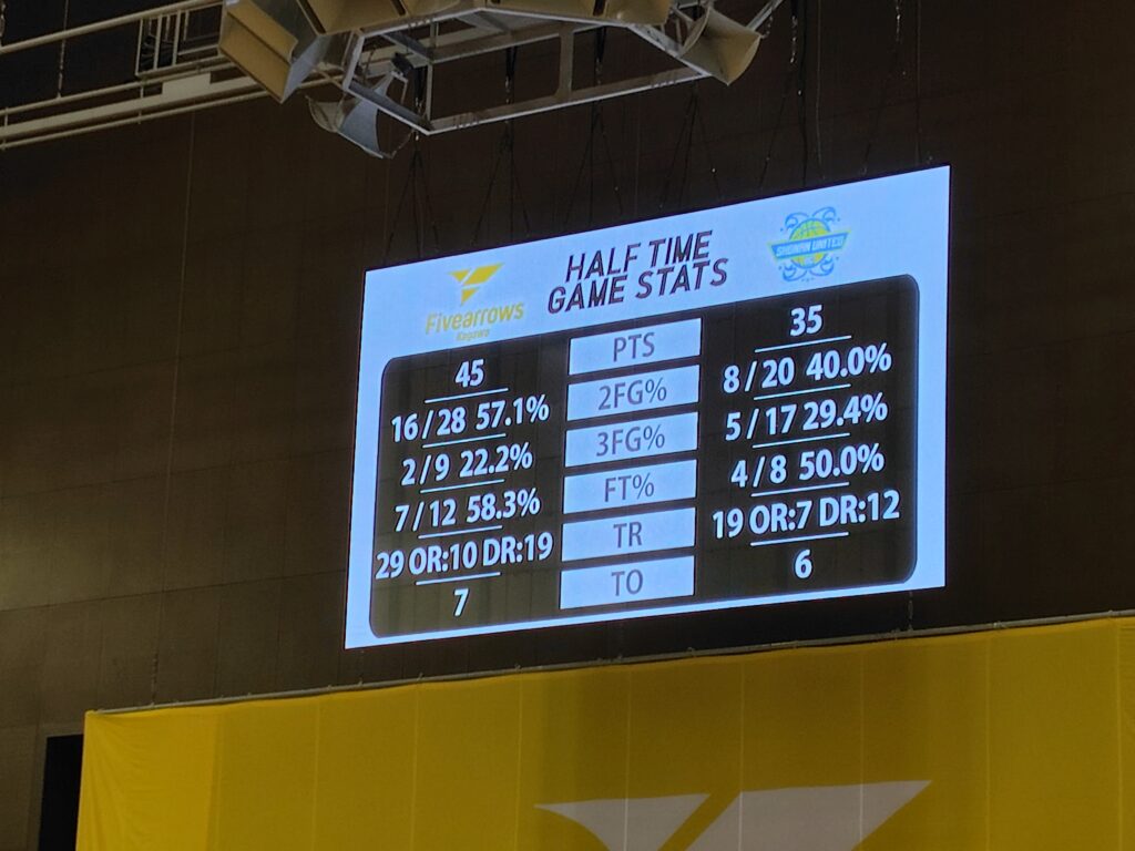 49秒残り、#8耕陽がオフェンスリバウンドを頑張り、そのまま入れて45-35!詰められても突き放せる強さが今シーズンのファイブアローズ。良いと思います。その後スコアは動かず第2Q終了。まだまだ予断を許さない感じ。