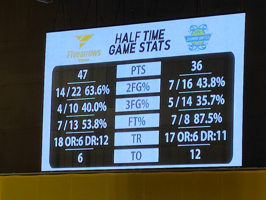 湘南は先日同様、3Pシュートを多投。「打たない事には入らない」と言わんばかりに打ちまくる。体感的に昨日より入ったので、ファイブアローズ的には嫌な感じです。