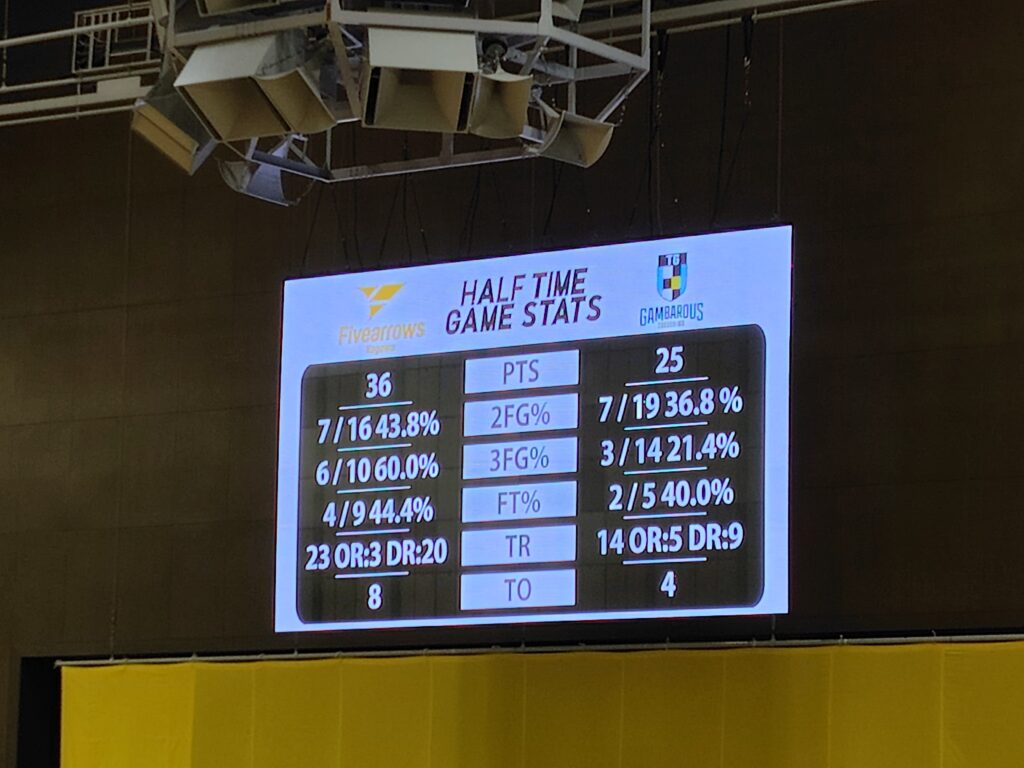 その後もファイブアローズは全く得点を奪えぬまま、#4ドーソン選手のレイアップや#77森山選手の3P等で逆転、36-37。