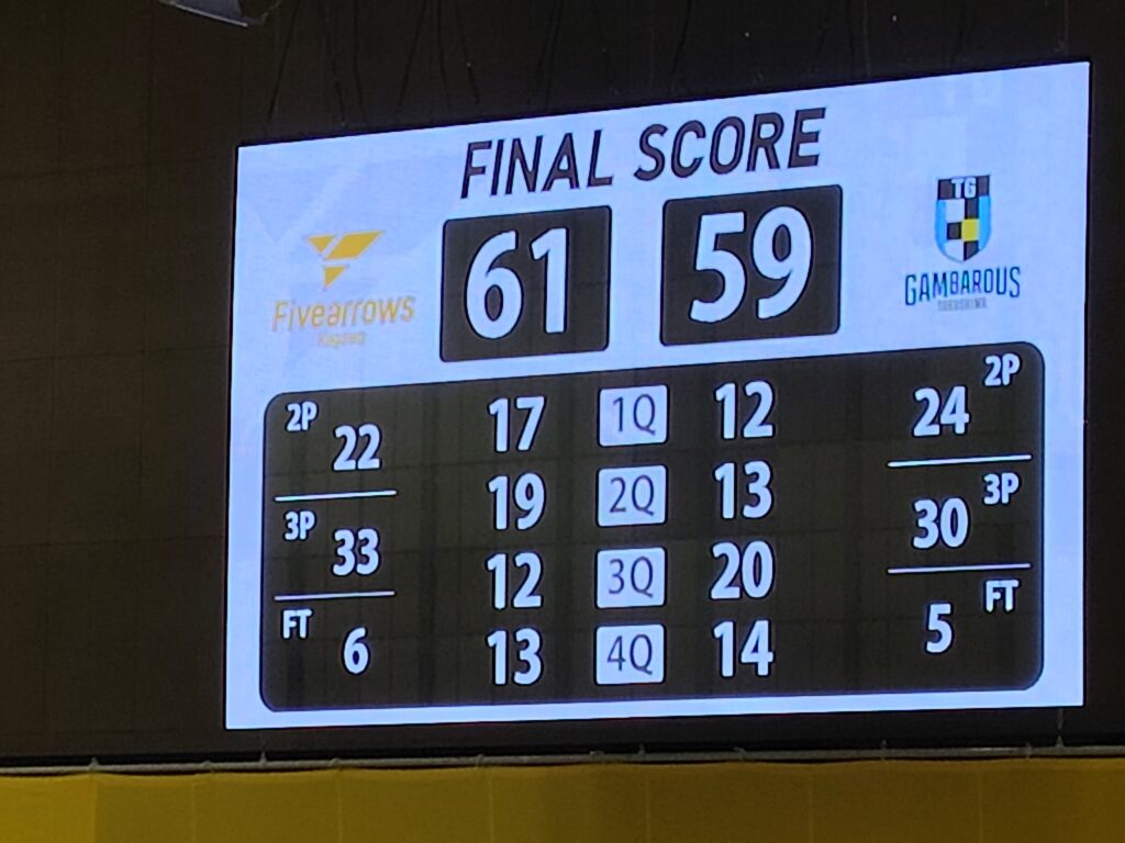 終了間際、この日ずっとファイブアローズを苦しめ続けた徳島#77森山選手がさすがの3Pを沈め追いすがるも、ファイブアローズは再逆転を許さずタイムアップ。61-59で試合終了、香川ファイブアローズ勝利。