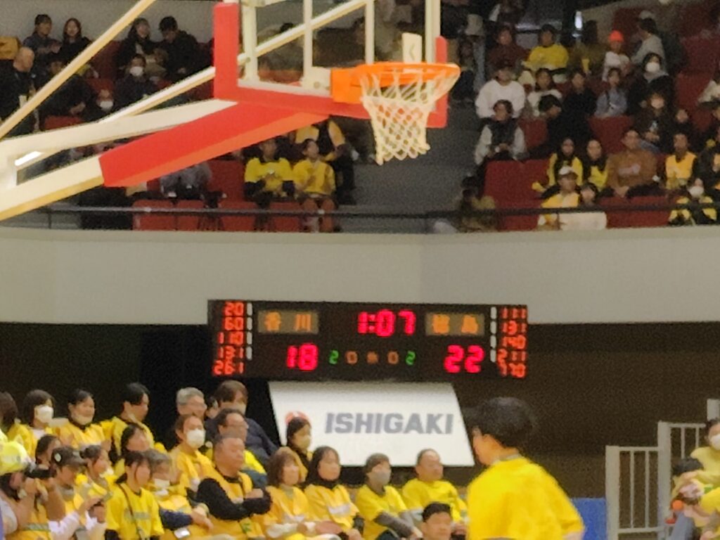 徳島#0アダムス選手が3P時のファウルを貰ってフリースロー3ショット。しかしここは「黄色い要塞・高松市総合体育館」。「第6の敵」がきっちり仕事をし、3ショットを全て落とさせる。いやー汗だくだったね。この日、特にこのアダムス選手はフリースローが可哀そうなくらい入らず、頭を悩ませていました。ぶっちゃけると、あなぶきアリーナ香川より高松市総合体育館の方が第6の敵がいい仕事できます。やっぱり「近い」んでね。まとまりやすいです。