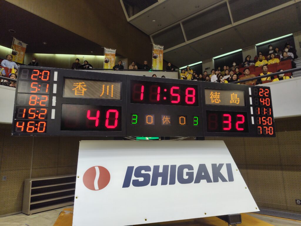 残り3:11、キレキレの#13育実のドライブで徳島も4ファウル。お互いのディフェンスが迫力満点で、正に潰し合いの様相を呈す。本日は前日と違い徳島の3Pが前半から火を噴き、ファイブアローズとしては苦しい展開。なんでもデータ分析をしている方によると、「香川ファイブアローズは2P比率の最も高い&3P比率の最も低いチーム」で「徳島ガンバロウズは2P比率の最も低い&3P比率の最も高いチーム」なのだとか(「くーあい」さんという方の「X」より参考にさせて頂きました。@chaokeai_xia)。この試合は正にそんな感じで、香川ファイブアローズはあくまで2Pで勝負、徳島ガンバロウズは外からもガンガン打つ感じ。面白いね!