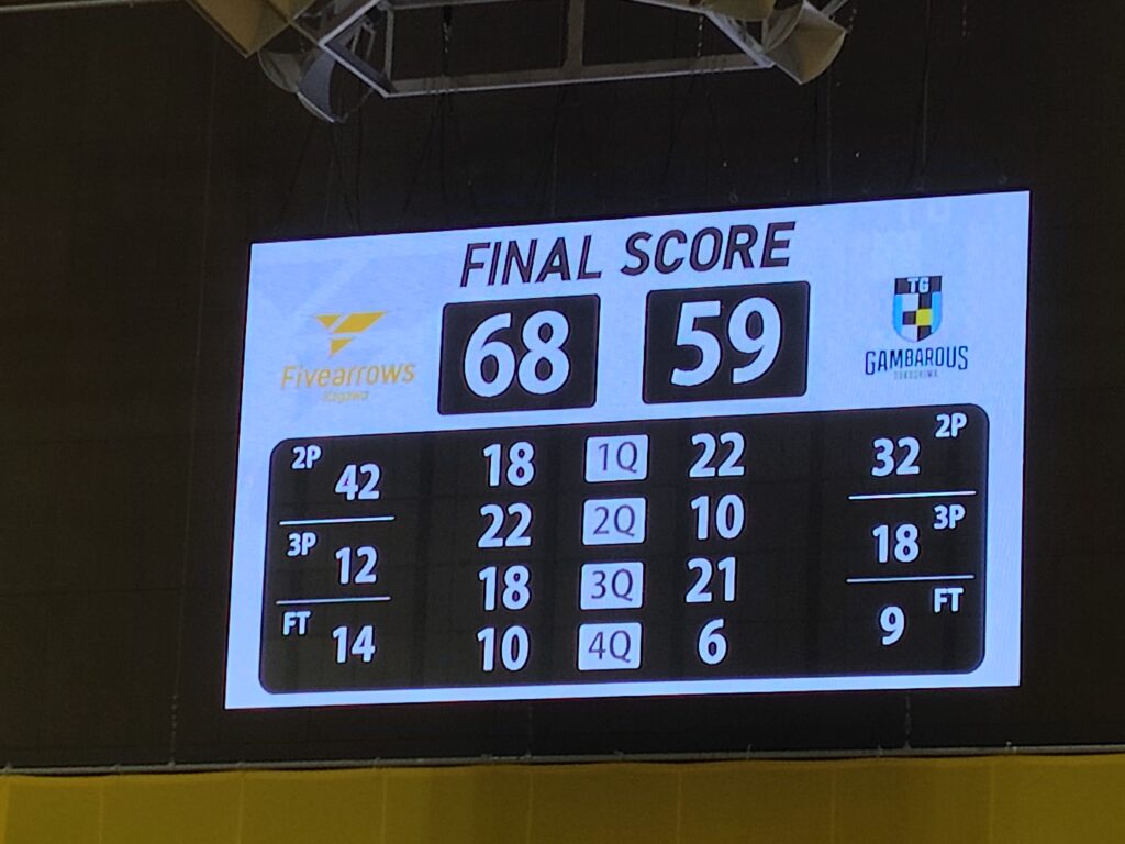 最後の最後までファイブアローズは気合の入ったディフェンスで徳島へ「打たされたショット」を強いり、そのまま試合終了。68-59でファイブアローズ勝利!あの徳島ガンバロウズを2試合連続59点に抑えるチームが他にいるだろうか(反語)。そのくらいこの二日間、特にGAME2のディフェンスは凄かったです。