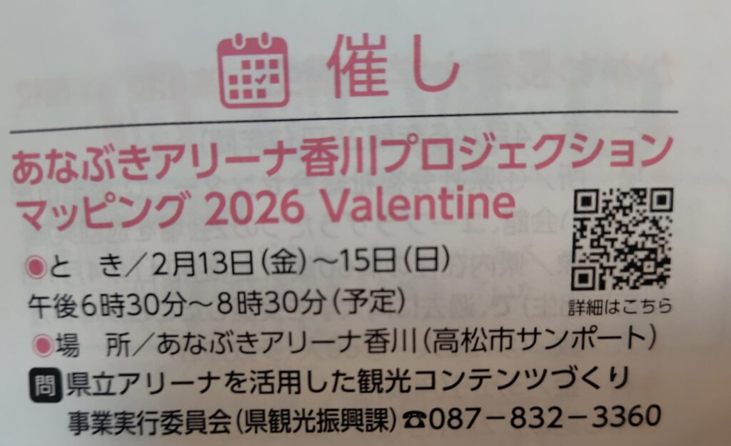 最後におまけで、次の香川ファイブアローズのホームは2/14,15とあなぶきアリーナ香川での八王子ビートレインズ戦なのですが、この日はあなぶきアリーナ香川で18:30~20:30までプロジェクションマッピングがあります。