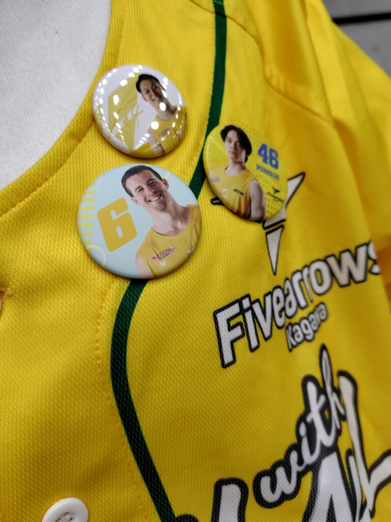 はじめTシャツにガチャから出たバッチを付けた図