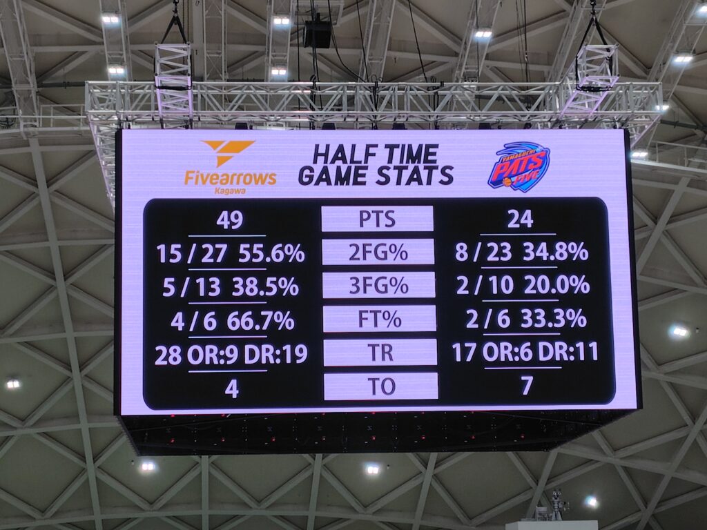 終了間際に#5ADがゴール下で2Pを取り、49-24ファイブアローズリードで第2Q終了。一気に来たねこれ。