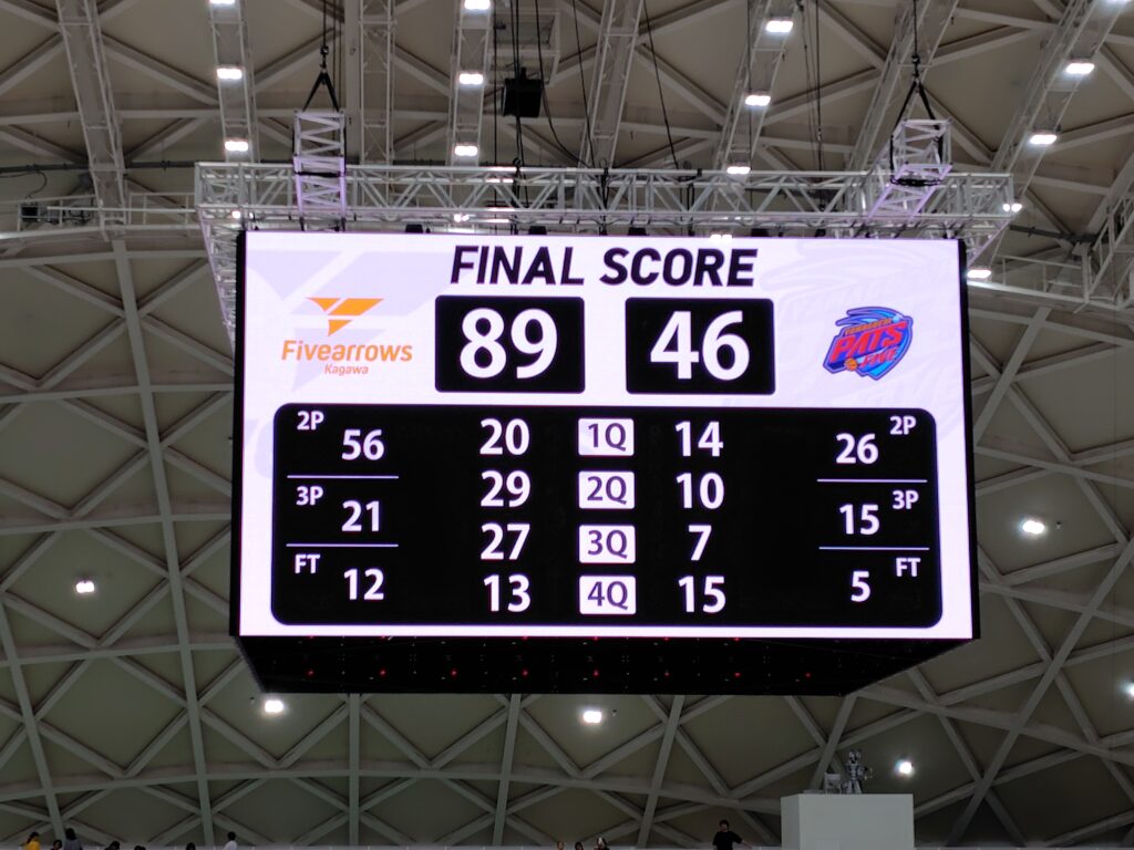 山口もそれほど得点を伸ばせず、89-46ファイブアローズ勝利で試合終了。びっくりするぐらいの大勝でした!
