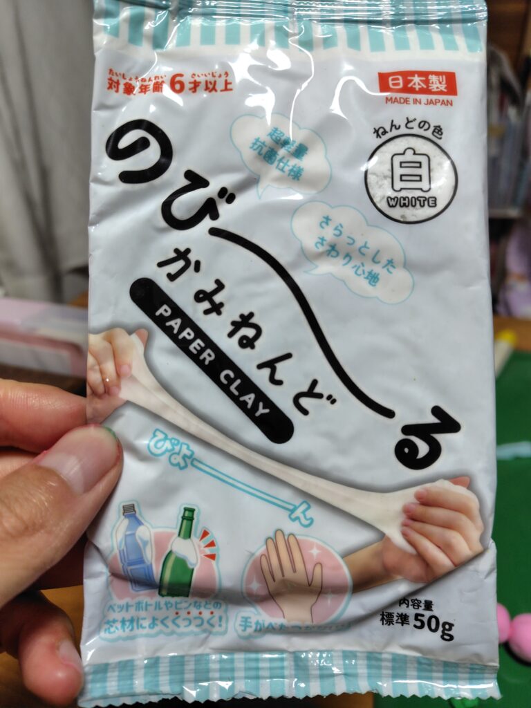 今回は「ダイソー」さんではなく「CAN☆DO」さんで仕入れた品ですが、恐らく他の100円ショップでも類似商品が入手可能かと思われます。こちら一般的な紙粘土に比べて柔らかく色々な形に加工しやすいため、とっても楽しく工作を楽しめます。またすぐに固まらない為、ボロボロと破片が落ちる事もありません。