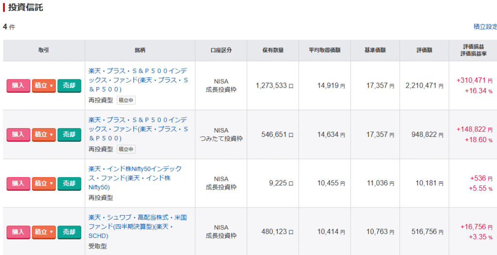 私がコアに積み立てているのは上2行の「楽天・プラス・S&P500インデックス・ファンド」(楽天S&P500)。5年後にはそれだけで新NISA上限の1,800万円埋めきる予定だが、去年お試しで1万円くらい買った「インド株」(3行目)、今年10月末に高配当株の経験として50万円分買った「楽天SCHD」(4行目)がある。