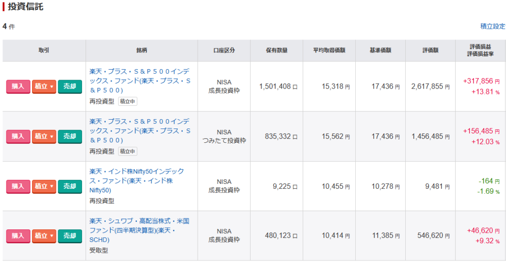 こちらは株主優待目当ての個別株「楽天グループ(4755)」と、1年間かけて計360万円積み立てる予定の「S&P500」がある。