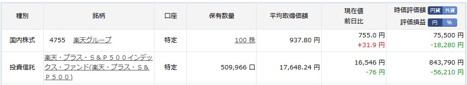 株主優待目当ての「楽天グループ」100株と、今年1年間だけ月30万円積み立てしている「楽天S&P500」がある。楽天経済圏の住民として、個人的に楽天には頑張って欲しいが投資家からの評価は厳しいようで。携帯電話の通信量が安くなったのは間違いなく楽天の功績なので、何とか黒字化して投資家を見返して欲しい。頑張れ楽天!