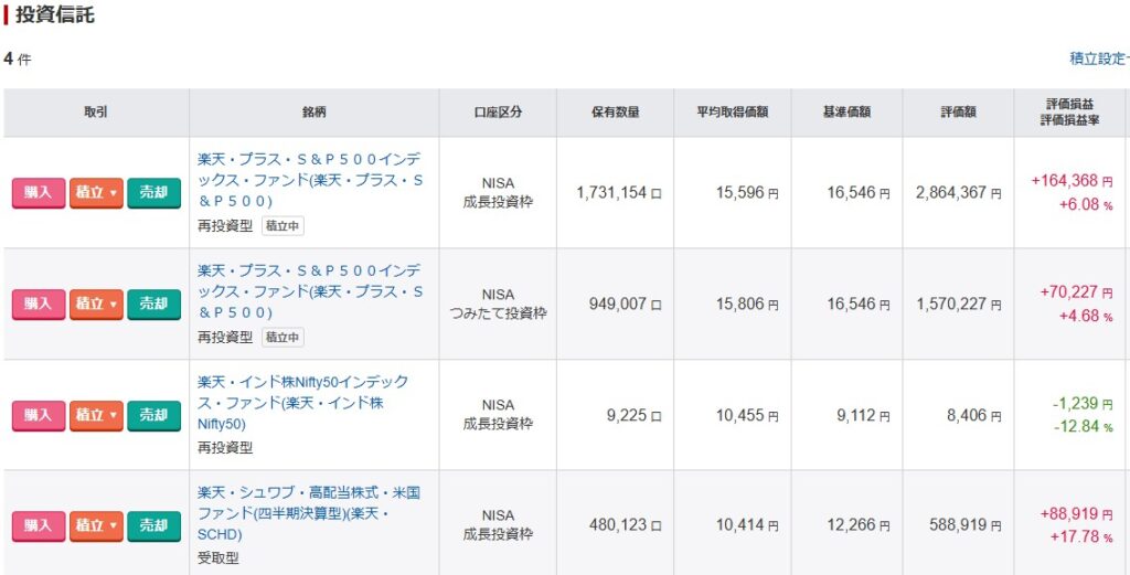 上2行、メインの「楽天S&P500」を見ていく。成長投資枠とつみたて投資枠で2行に分かれているのでややこしいが合算すると、30万円×13か月目だが昨年末新NISAの枠を埋める為、年末に30万円追加入金したので、取得金額は420万円、評価額4,396,874円、評価損益+496,875円、評価損益率は+5.58%となった。