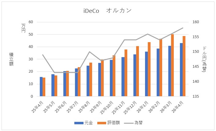 iDeCoは新NISAのS&P500とは違い「楽天・プラス・オールカントリー株式インデックス・ファンド」(楽天オルカン)を積み立てている。取得金額430,988円に対して評価額486,892円、評価損益+55,904円、評価損益率は+12.97%となった。