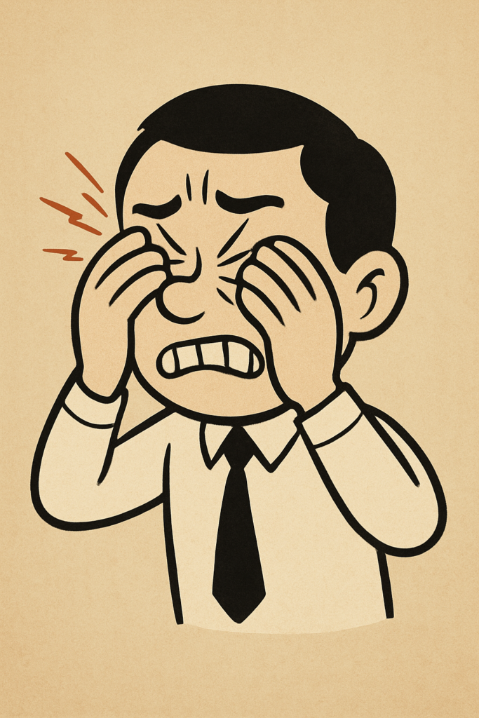 これあれですわ。ゲレンデの「雪目」と同じで、数時間もずっと白っぽい道路見てたんで、目日焼けしたんですね。