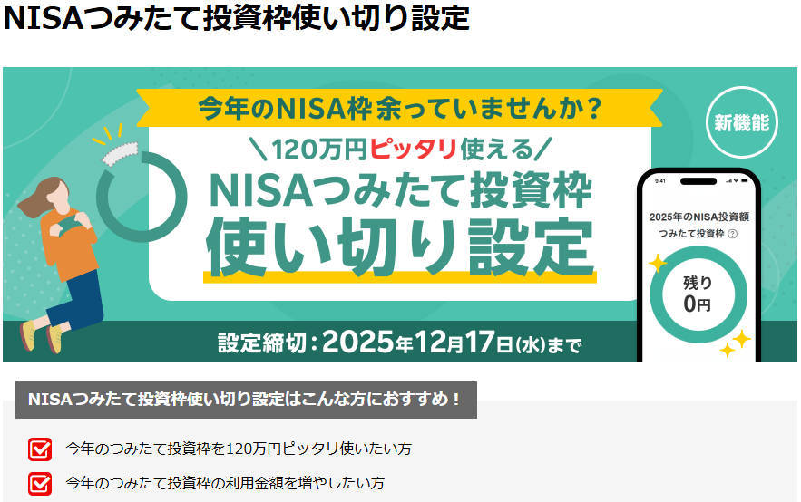 新NISAトップ画面に戻ると、きれいに年間上限使い切ったことが確認できました。