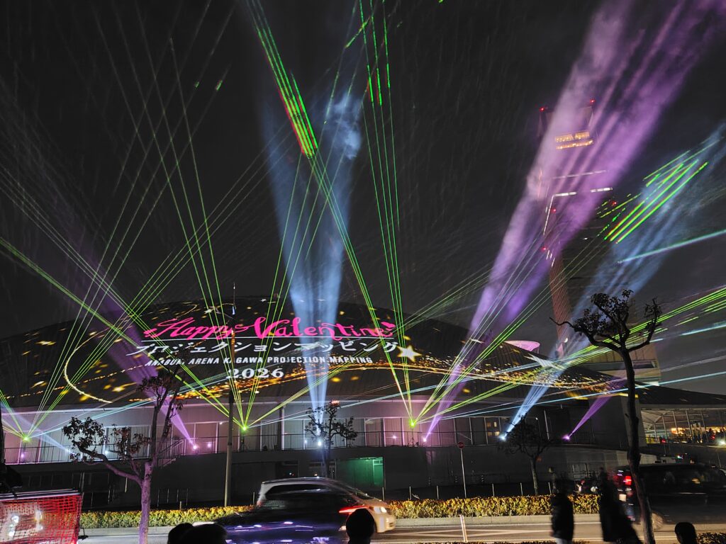 あなぶきアリーナ香川は2025年2月オープン。その後、たびたびこういった「行くきっかけ作り」みたいなプロジェクションマッピングのイベントをしていて、私の記憶が確かならば今回で3回目の実施となります。ちなみに我が家はその全てに参加しています。